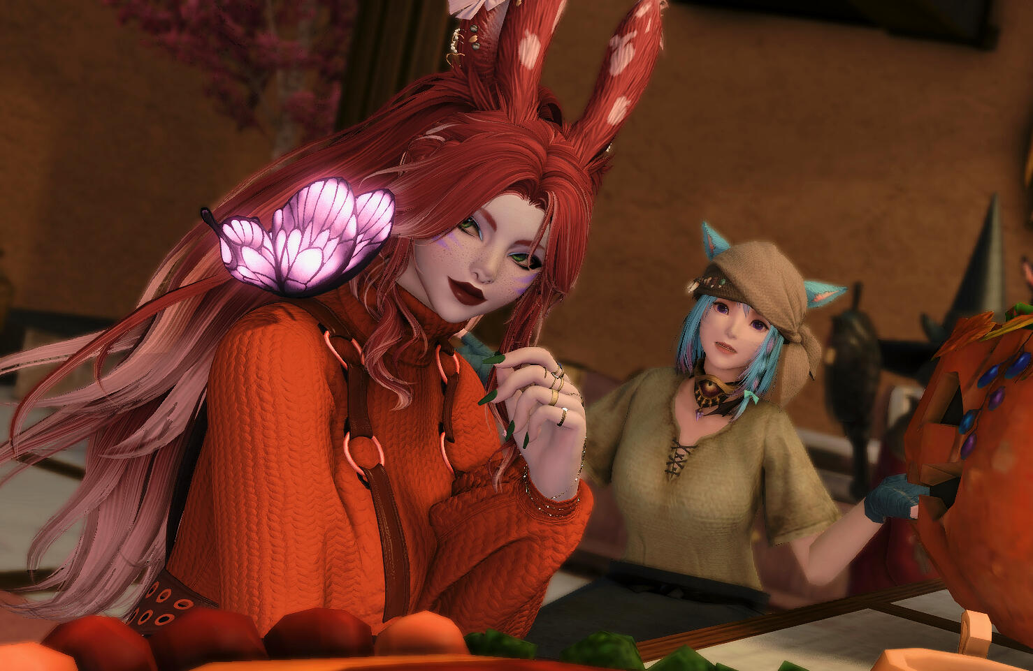 Lynnea has a slight tendency to be proud and a little arrogant and often puts her entomological interests first. However, an epoch of loneliness in the wilderness means that she has developed great patience – such a trait certainly helps when one needs to spend bell after bell observing and categorising insects! - and her instinctive wariness and baseless dislike of smaller races is often managed relatively skilfully as a result. Lynnea holds other Veena in high regards and this courtesy is extended to Rava too. She has a complete weakness for Elezen women, often changing her opinions (unless they concern vilekin or her loved one) to agree with an Elezen that she considers to be particularly aesthetically pleasing or displaying personality traits that she finds agreeable.She might initially be a little standoffish with other races, but it isn't too tricky to win her over with a few cups of expensive coffee blends, the promise of spending time looking for bugs, or chatting about smutty novels. So long as anyone keen on her company can put up with a few derisive snorts and smirks and moments where her imagination wanders, leading her to ask rather direct and sometimes all too personal questions.Due to her upbringing and leaving the coldness of her home on bad terms, family and mothers can be a particular sore spot for this Veena, drawing forth more guarded and wary reactions. The time she spent alone was geared very much towards isolation and survival. When the going gets tough in combat situations, this redheaded bun's first instincts tend towards running, hiding and avoiding anything getting worse - fighting is a last resort!Lynnea is in a devoted relationship with Phoenix Lormark, a tall and mysteriously guarded Duskwight woman. Although the two are equals, Lynnea shows this commitment and her loyalty by wearing an ornate collar decorated with silver and gold leaf reliefs. She cannot remove this, nor does she wish to given the strength of their relationship.